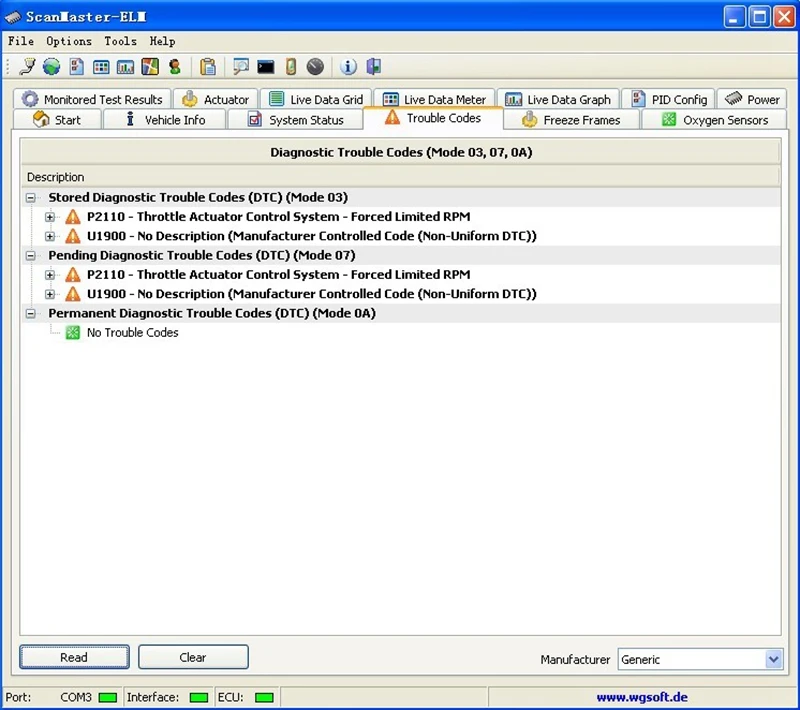 - Читати діагностичні коди помилок як стандартні, так і спеціальні коди виробника, а також показувати їх значення;