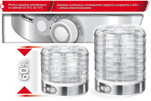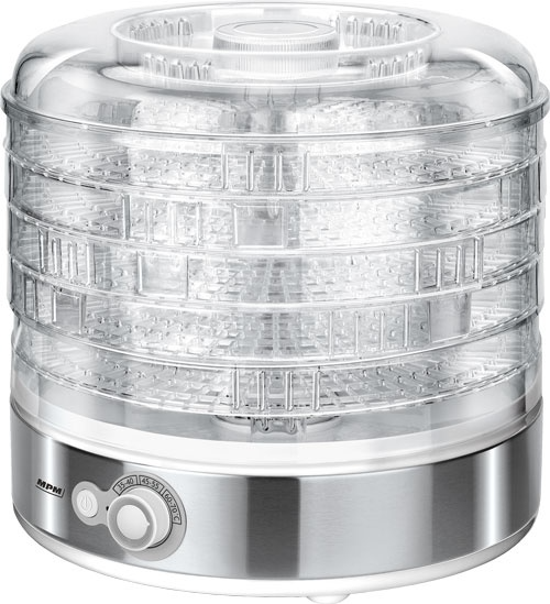 Сушка для фруктів і овочів Mpm MSG-11 з електронним управлінням виготовлена з високоміцного пластика. 5 піддонів дозволяють сушити різні овочі і фрукти без змішання запахів.