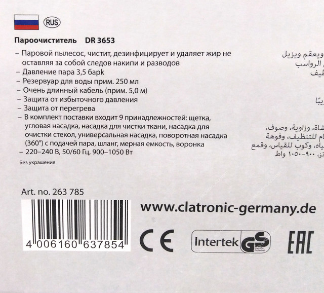 З пароочищувачем DR 3653 від Clatronic ви отримаєте ідеальний інструмент для прибирання будинку. Пароочисник очищає, знежирює і дезінфікує без залишків вапняного нальоту і чистячих смуг.