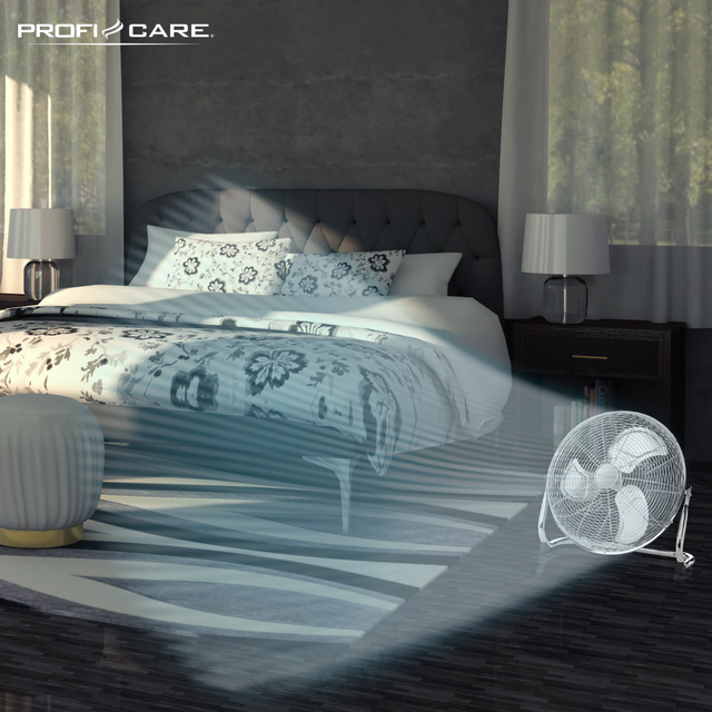 ProfiCare PC-VL 3066 WM — висококласний підлоговий вентилятор діаметром 45 см , який ефективно охолоджує приміщення й забезпечує оптимальну температуру навіть у найспекотніші дні. Завдяки довгим металевим крилам циркуляція повітря майже на 40 % краще, ніж в інших вентиляторів.