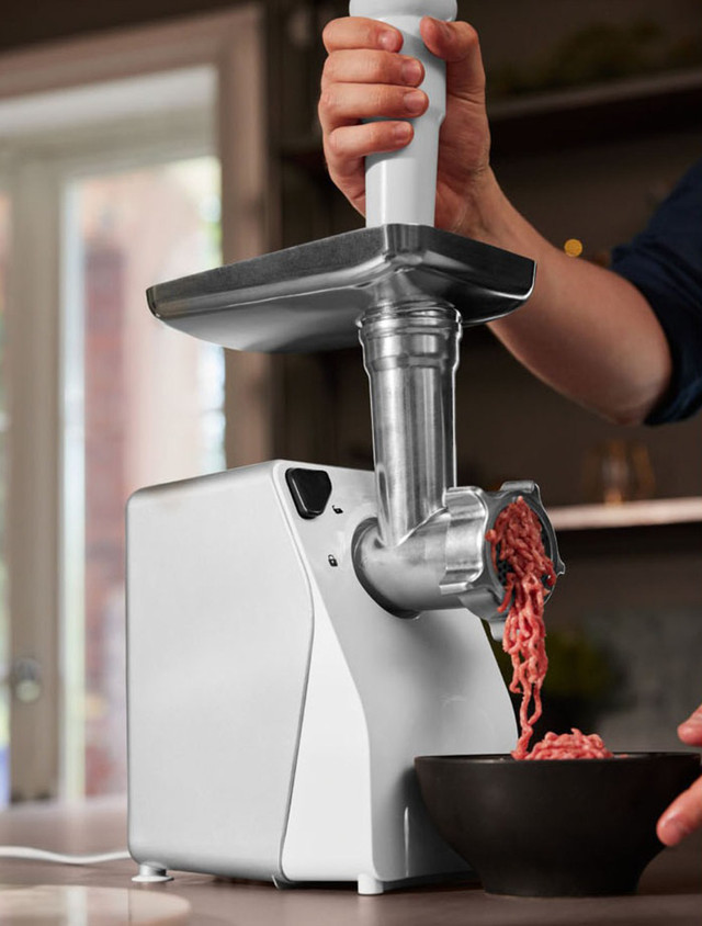 Багатофункціональна техніка має місткий і міцний лоток з алюмінію, до комплекту входять з отворами різного калібру для помелу м'яса необхідної консистенції, додаткові насадки для ковбасок і «кебе» допоможуть істотно розширити й урізноманітнити ваш повсякденний раціон.