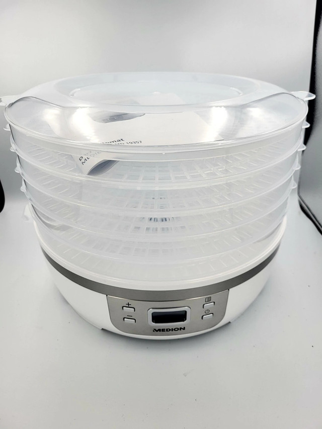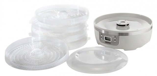 Представляємо вам дегідратор MEDION MD 19357 — справжній витвір мистецтва у світі сушіння фруктів, овочів і зелені. Ця елегантна сушарка поєднує в собі міцність і вишуканість, ставши чудовою прикрасою вашої кухні.
