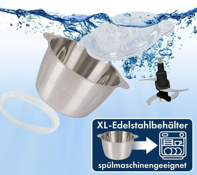 Конструкція пристрою дає змогу керувати ним однією рукою . Подрібнювач обладнаний контейнером із неіржавкої сталі місткістю 1700 мл , тому пристрій допоможе й у приготуванні більших страв.