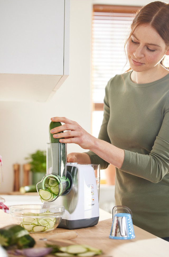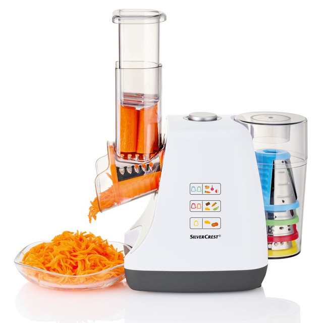 Багатофункціональність 5в1 Silver Crest SGR 150 E1 обладнана п'ятьма вставками для барабанів із гострими лезами з неіржавкої сталі, які дають змогу натирати, нарізати та зіскоблювати овочі, фрукти, шоколад, горіхи, твердий сир і багато іншого. Ви можете вибрати з двох різальних барабанів (дрібний і великий), двох скребкових барабанів (дрібний і великий), і спеціального скребкового барабана.