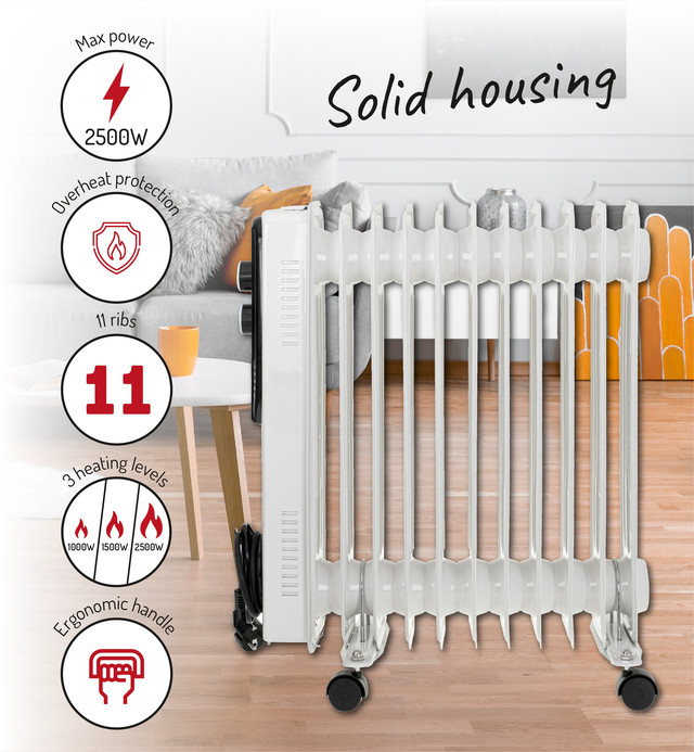 Для безпечного використання пристрій обладнаний захистом від перегрівання. Радіатор виготовлений в елегантних лініях, тому його можна розмістити там, де приймають гостей вдома або приймають клієнтів в офісі. Він має 11 нагрівальних ребер і потужність 2500 Вт.