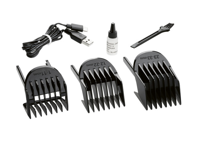 У комплекті — все необхідне: три насадки-гребіни, щітка для чищення, олива для лез і кабель для заряджання.