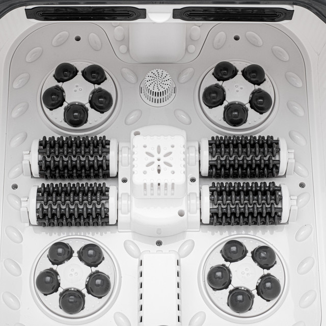 Завдяки системі 4 ролики + 4 масажні ролики ванночка-масажер впливає на активні точки стопи, стимулює нервові закінчення та покращує загальне самопочуття.